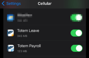- iOS: ไปที่การตั้งค่า (Settings) > เซลลูลาร์ (Cellular) ตรวจสอบให้แน่ใจว่าแอปพลิเคชัน Totem ถูกเปิดใช้งาน (Enabled) เพื่อใช้ข้อมูลเซลลูลาร์