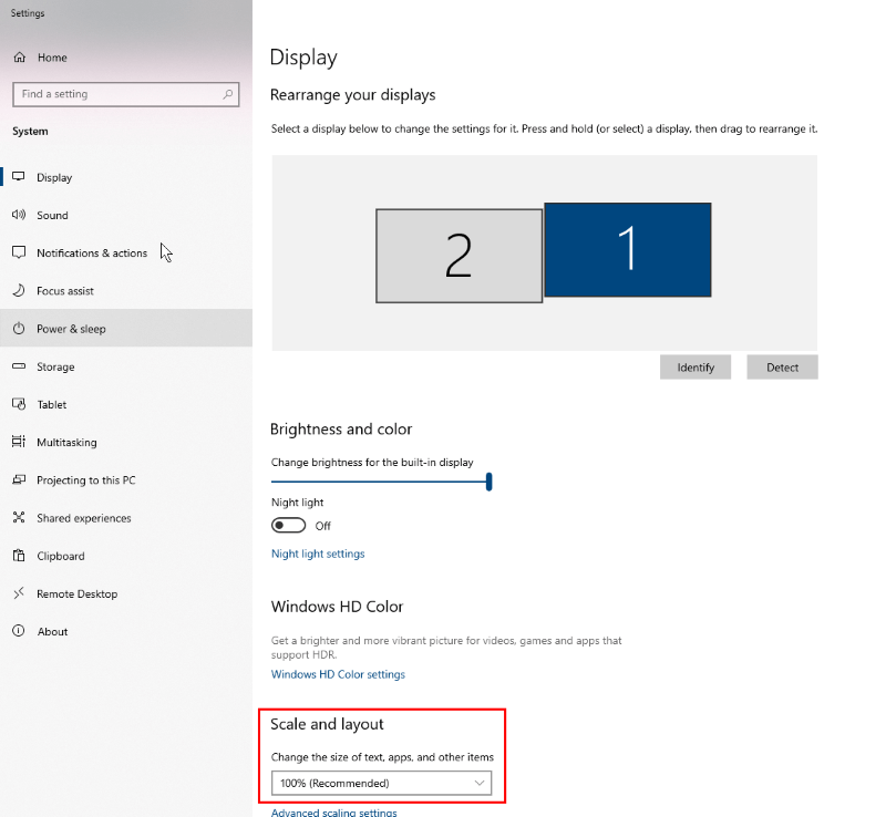 3. ไปที่หัวข้อ Scale and layout (มาตราส่วนและเลย์เอาต์) จากนั้นเลือกมาตราส่วนเป็น 100%